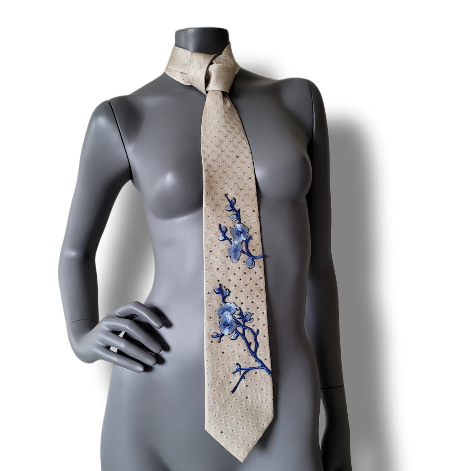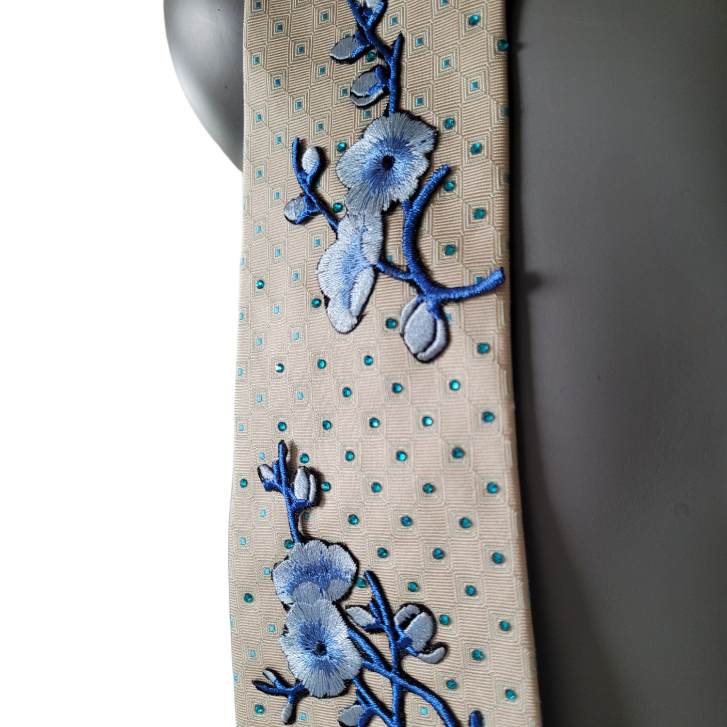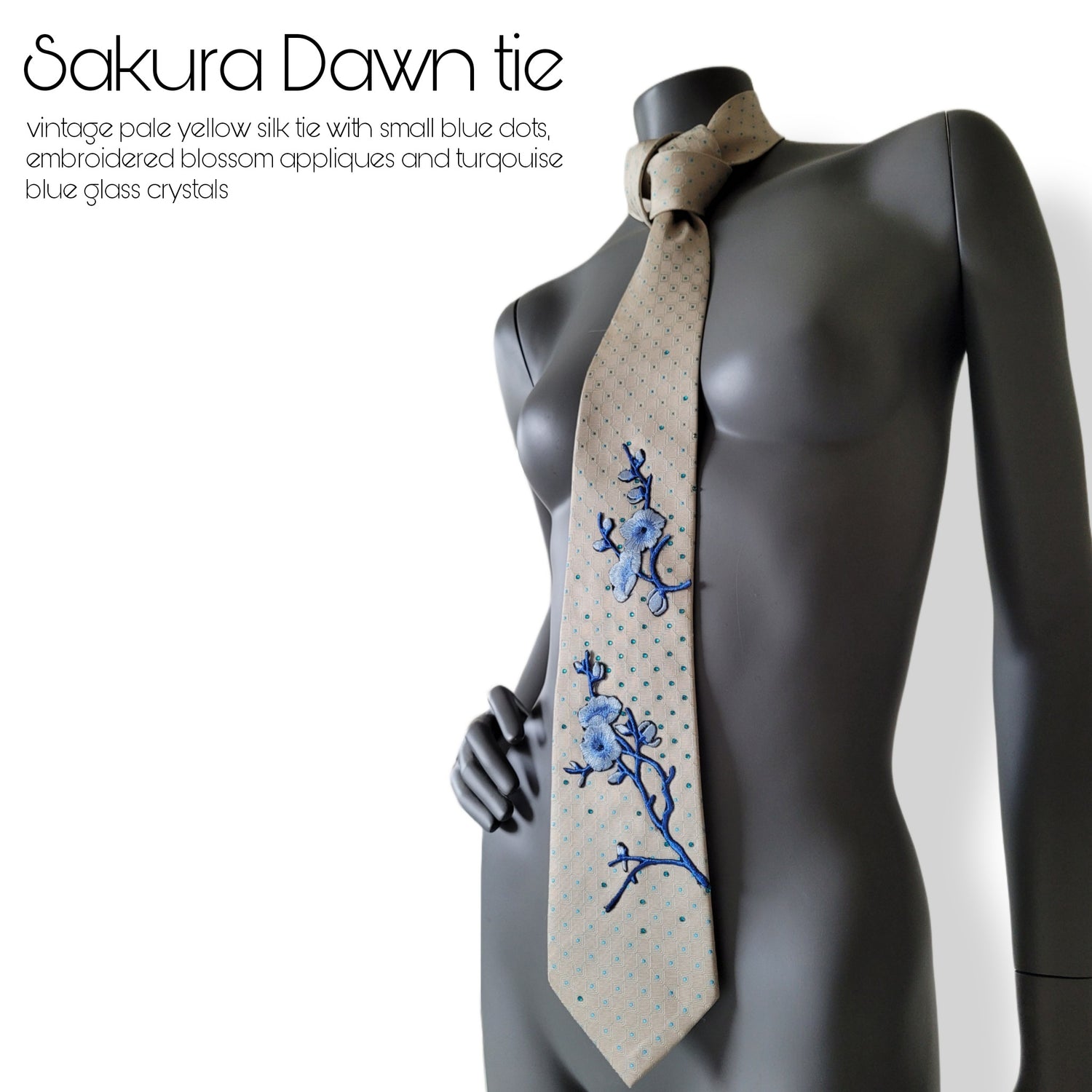 Material and colours: Pale yellow silk necktie with blue dots adorned with embroidered blue cherry blossom appliques with turqouise blue glass crystals.