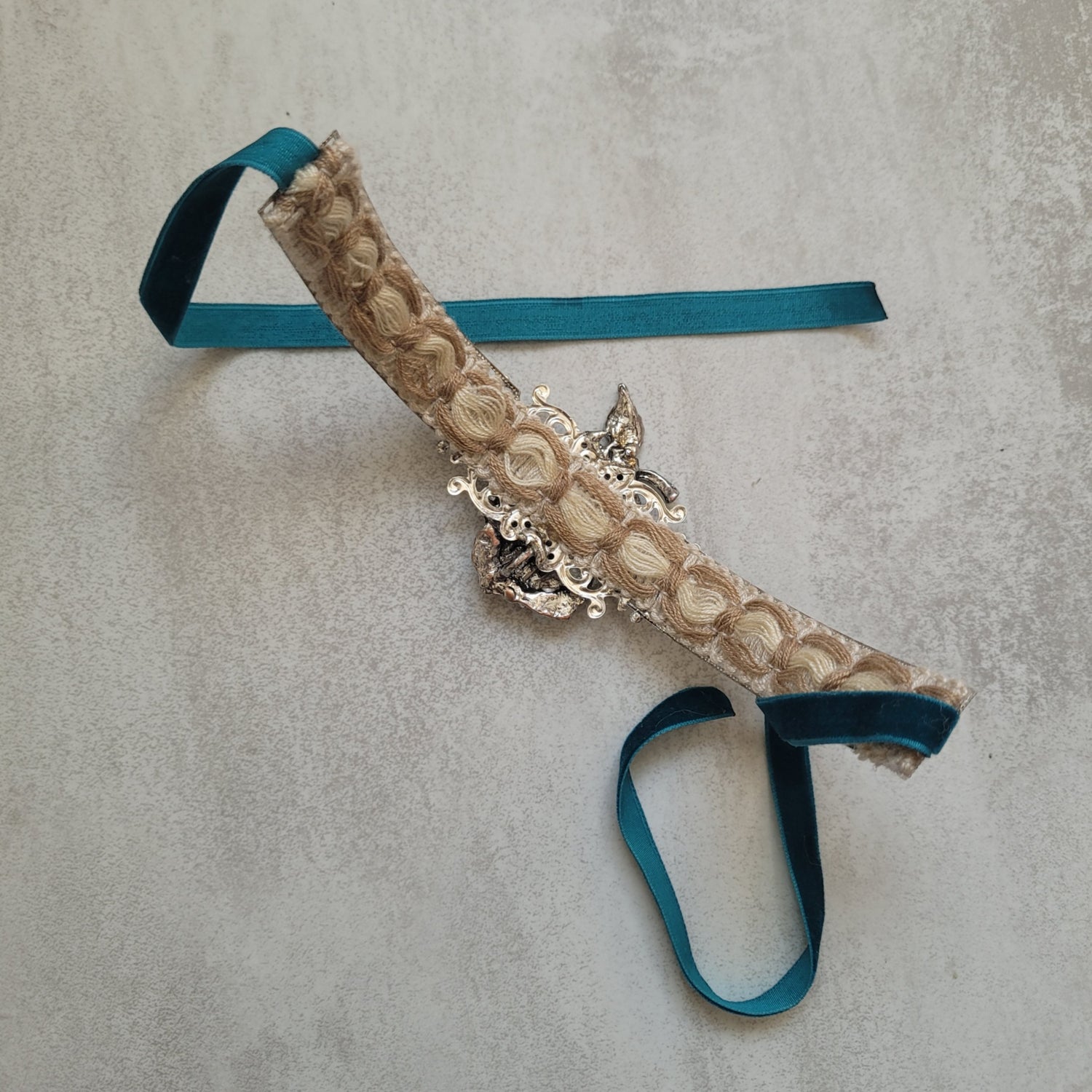 This piece ties in the back of the neck with velvet ribbons. The necklace is light weight, padded for maximal comfort and to avoid contact between skin and metal.